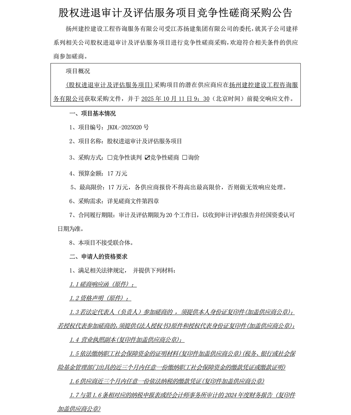 股权进退审计及评估服务项目竞争性磋商采购公告